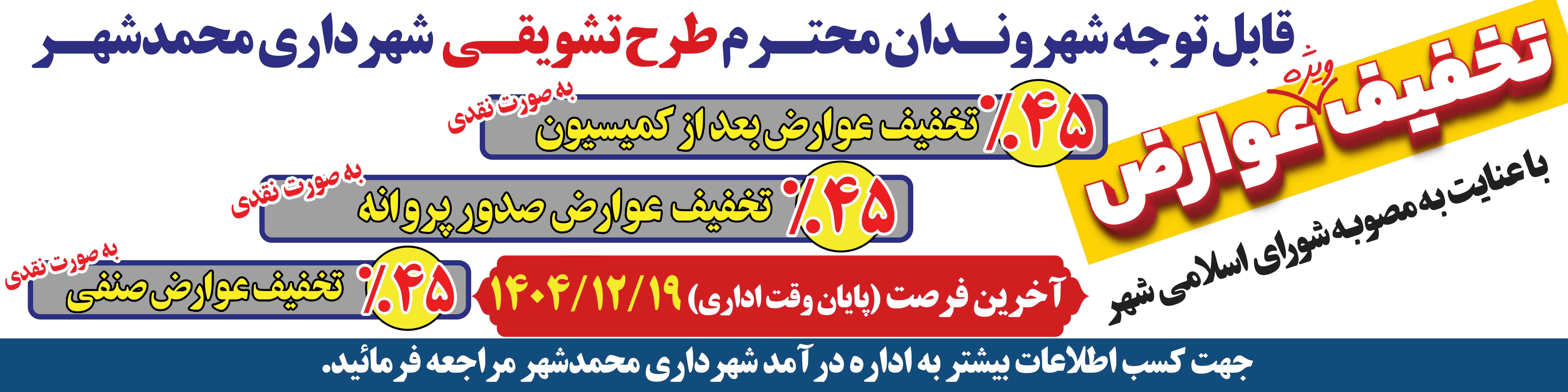 ادامه مطلببه گزارش خبر محمدشهر محمد مهرزاد، سخنگوی شورای اسلامی شهر محمدشهر، از آغاز اجرای طرح تخفیفات ویژه شهرداری خبر داد و اعلام کرد: 🔹با هدف حمایت از شهروندان، سازندگان و فعالان اقتصادی، طرح تخفیف ۴۵ درصدی دفترچه عوارض سال ۱۴۰۴ شهرداری محمدشهر از امروز آغاز شده و تا پایان وقت اداری روز ۱۹ اسفند ماه ۱۴۰۴ ادامه خواهد داشت.