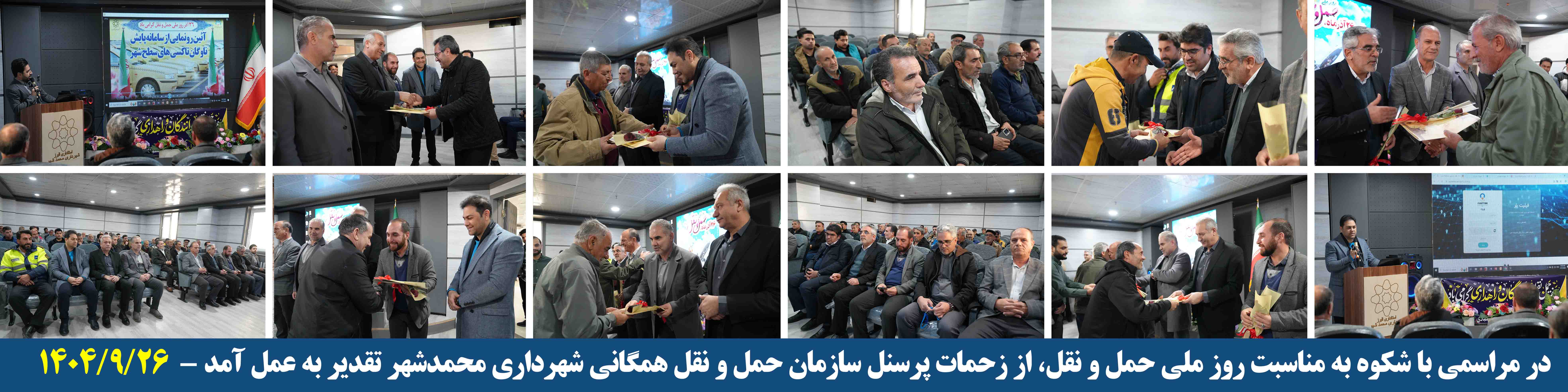 ادامه مطلبخبر محمدشهر: در مراسم تجلیل از رانندگان و فعالان حوزه حملونقل عمومی محمدشهر که به مناسبت ۲۶ آذر، روز ملی حملونقل برگزار شد ، کریم قدیانلو نایبرئیس شورای اسلامی شهر محمدشهر با تأکید بر ضرورت توجه ویژه به حوزه حملونقل عمومی گفت: «ناوگان حملونقل عمومی شهر، بهویژه تاکسیها، دیگر فرسوده شدهاند و لازم است برای نوسازی و تجهیز آنها به خودروهای جدید، برنامهای جامع تدوین شود.»